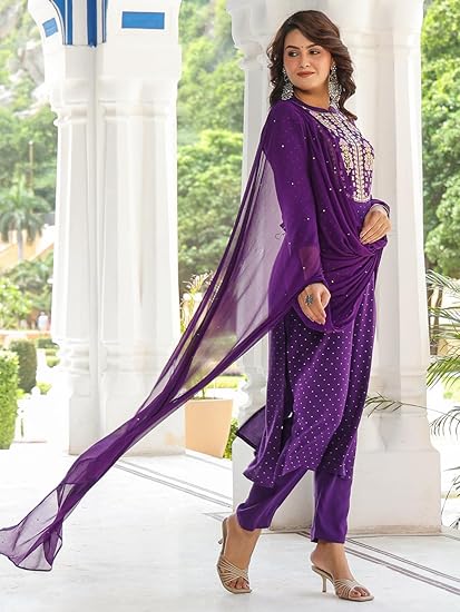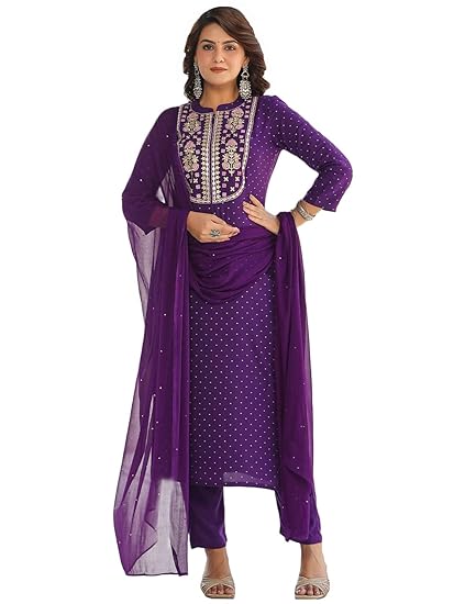 GoSriKi Women's Cotton Blend Straight Embroidered Kurta with Pant & Dupatta